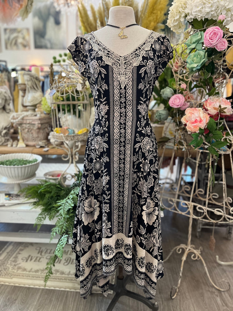 Ivory black border hanky hem midi dress
